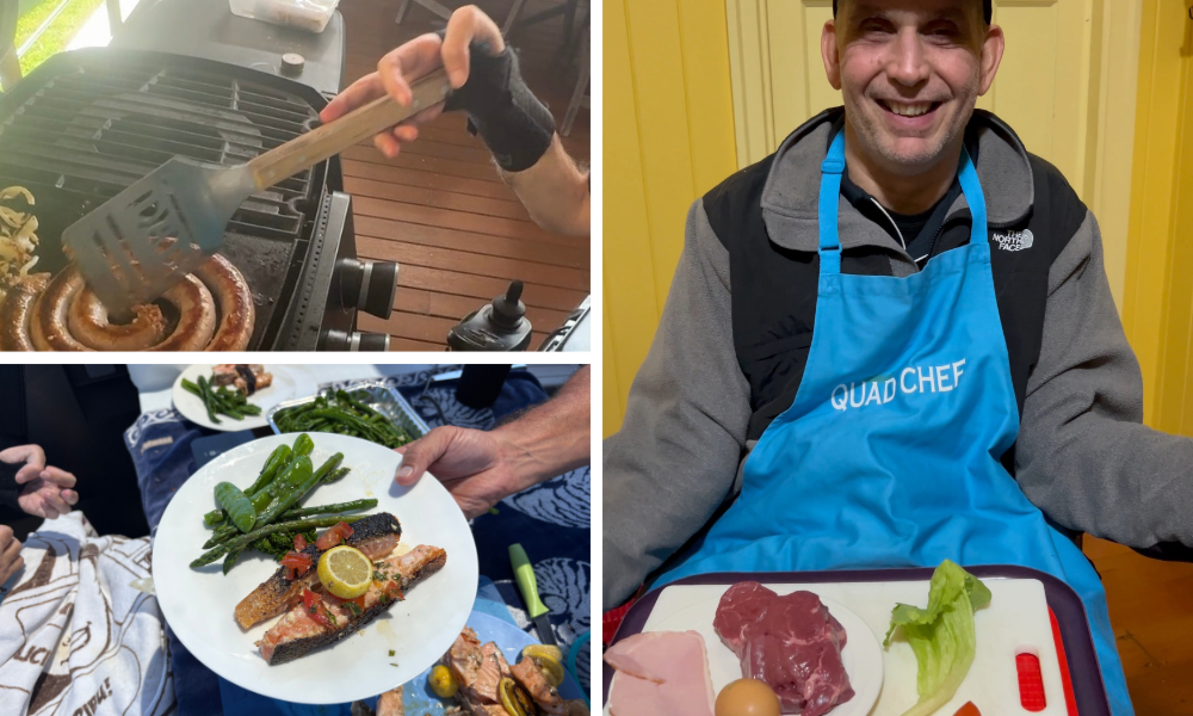 These days at home, things run a little differently — but the BBQ is still very much in business. With a modified cutting board, an adaptive knife, and a trusty support worker as my sous chef, I can prep salads, skewer meat, and experiment with different flavours. Once everything’s ready, I hook the spatula under my splint and get flipping.